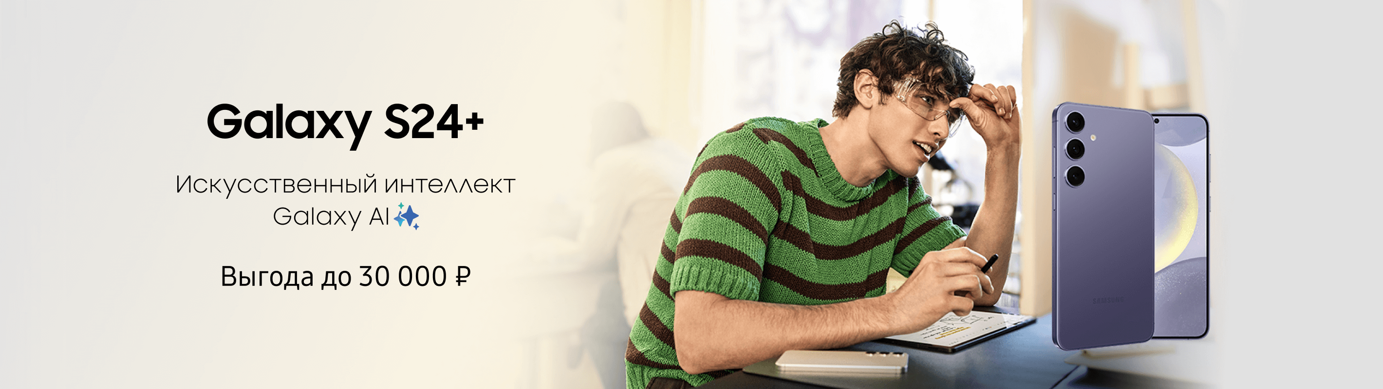 Период акции: 16.08.2024–31.10.2024. Гарантированная выгода 20 000 рублей предоставляется при покупке Galaxy S24 | S24+ и сдаче старого устройства в трейд-ин. В акции участвуют смартфоны Galaxy S24 | S24+.
