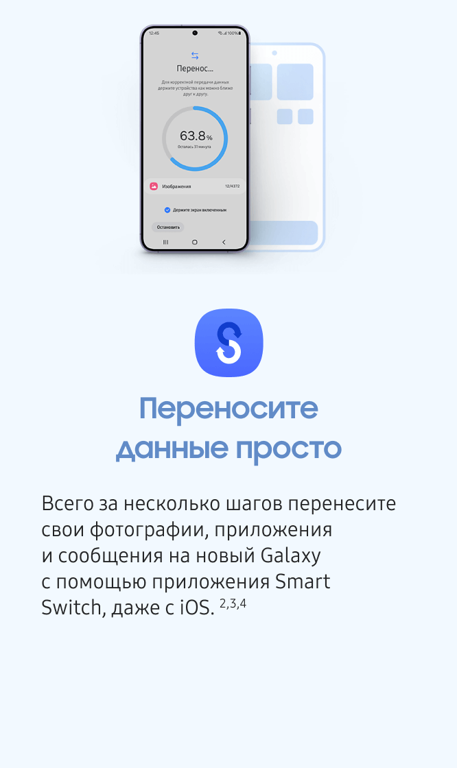 Для проводной передачи данных с iOS требуется, чтобы на принимающем устройстве была установлена ОС Android™ 4.3 или выше, а на передающем — iOS 5 или выше. Передачу можно выполнять без кабеля через беспроводное соединение или iCloud. Для беспроводного подключения требуется, чтобы на принимающем устройстве была установлена ОС Android™ 4.0 или выше, а на отправляющем устройстве — iOS 12 или выше. Для передачи данных через iCloud требуется, чтобы на принимающем устройстве была установлена ОС Android™ 4.0 или выше, а на отправляющем устройстве — ОС iOS 5 или выше. Откройте приложение Smart Switch Mobile в разделе «Настройки» на принимающем устройстве Galaxy или загрузите это приложение Smart Switch Mobile из магазина Galaxy Store. Для беспроводной передачи данных загрузите приложение Smart Switch для iOS из магазина App Store на iPhone или iPad. Данные и контент, доступные для переноса, могут зависеть от способа передачи данных.